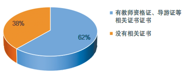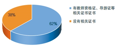 3.相关资质:基地、机构内的研学导师从业资质情况较好,但是仍有1/3左右的没有任何资格证。