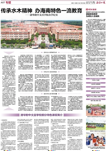 此外,值得一提的是,多年来,清华附中面向未来积极探索创新人才培养模式,先后通过开设“大学预科班”“高中理科试验班”“马约翰体育班”“一条龙试验班”“美术特色班”等特色班,为学生的个性化发展提供广阔舞台,教育水平和办学质量不断提升。文昌学校秉承清华附中办学理念,注重借鉴先进教育模式和训练方法,积极探索与当地资源有机结合的特色教育之路,拟在即将开学的高中部设立“高等项目研究实验班”“马约翰体育班”和“美术特色班”,采取自主招生办法在全省范围内招生,招生人数占每年文昌学校中招人数的20%。