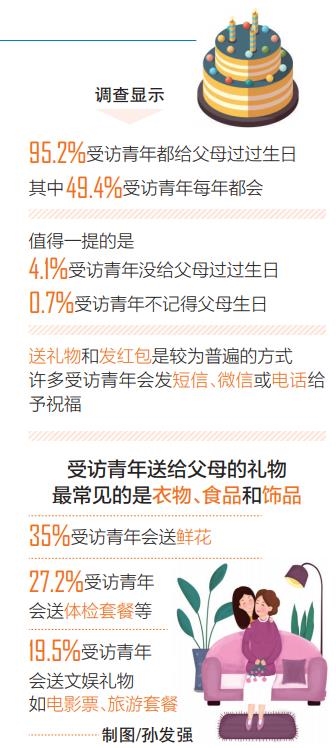 近日,中国青年报社社会调查中心通过问卷网,对1515名青年进行的一项调查显示,95.2%的受访青年给父母过过生日,95.8%的受访青年表示父母需要有这种仪式感。
