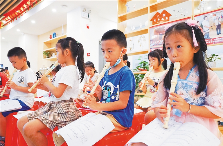 7月20日,小学生们在三亚市天涯区党群服务中心学习少儿笛子。