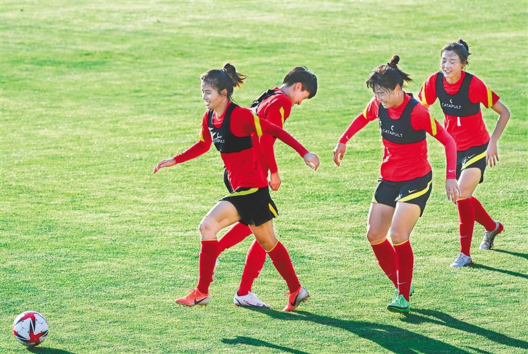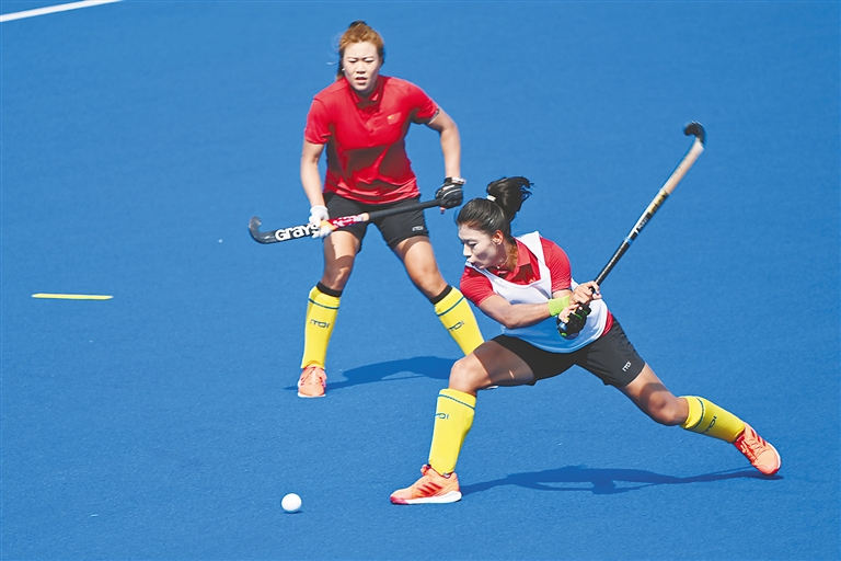 中国女子曲棍球队队员谷丙凤(右)在训练中挥杆击球。