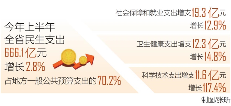其中,全省民生支出666.1亿元,增长2.8%,占地方一般公共预算支出的70.2%。分项目看,社会保障和就业支出增支19.3亿元,增长12.9%;卫生健康支出增支12.3亿元,增长14.8%;科学技术支出增支11.6亿元,增长117.4%。不难看出,财政支出对社会保障、卫生健康等基本民生和增强科技发展动力等方面保障有力。