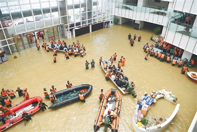 由于连日降雨形成的严重积水无法及时排除,7月22日上午,郑州市中牟县阜外华中心血管病医院开始转移病患、病患家属和医护人员。图为救援人员在积水的大厅内驾驶舟艇转移病患。 新华社记者 姚竣译 摄