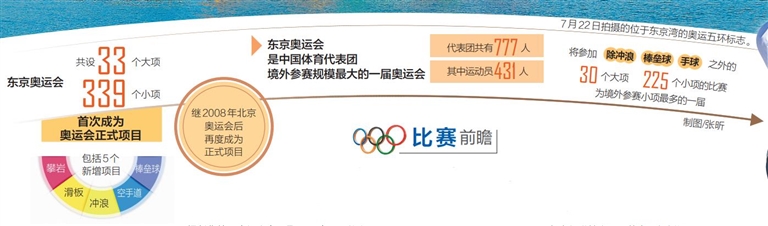 东京奥运会共设33个大项、339个小项,包括5个新增项目:攀岩、滑板、冲浪、空手道和棒垒球,其中棒垒球是继2008年北京奥运会后再度成为正式项目,其他四项是首次成为奥运会正式项目。