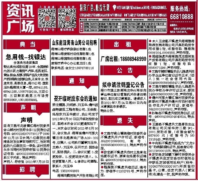 ●程燕荣不慎遗失准迁证,编号为:琼准字01202783号,声明作废。
