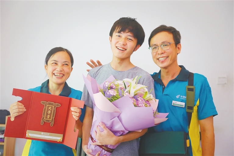 对于海口邮政投递员卢志强来说,7月25日是他从业30年来的“高光时刻”。当天,他投递了一份特殊的快件——来自北京大学元培学院的录取通知书,收件人是儿子卢海山。