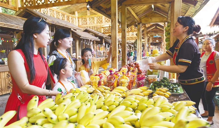 经过景区与村民的用心经营,曾经的扶贫一条街,已成为远近闻名的“致富街”。“我的铺面主要经营黎锦等民族特色产品,旅游旺季生意最好,一天的营收能达到3000元!”惠农街商铺经营者陈小斌语气里透着自豪。