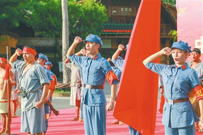 “五指山峰翠相连,万泉河水清又清……”6月29日,保亭黎族苗族自治县槟榔谷黎苗文化旅游区举行庆祝中国共产党成立100周年主题活动,身着红军装、黎族服饰的景区演员,表演了由该景区精心创作的舞剧《党旗高高飘扬》,展现景区员工爱党爱国的赤诚情怀。