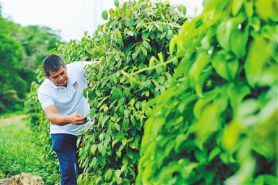 “涨了!去年每斤胡椒收购价十五六元,今年突破20元。”7月26日,在位于海口市琼山区大坡镇的海南农垦标准化胡椒种植基地中,胡椒藤茂盛生长,郁郁葱葱。种植户黄丽贞忙着给刚采摘完的胡椒修枝剪叶,以保来年胡椒丰产。“价格涨了,我们当然更有动力管胡椒了。”
