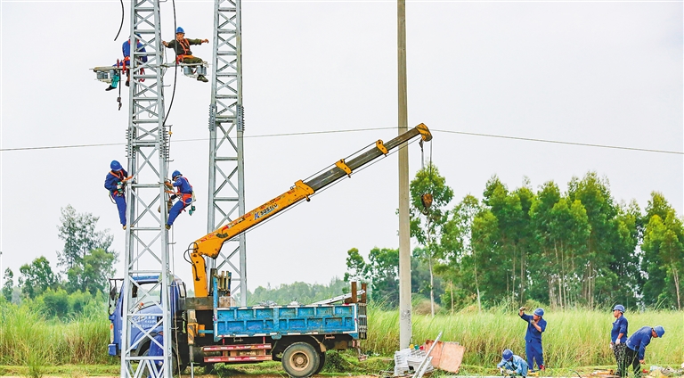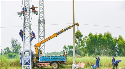 7月25日,在儋州市新州镇盐场村,电网工作人员对农村电网进行升级改造。据介绍,儋州结合美丽乡村建设布局低压电网,美化村容村貌,助力乡村振兴。本报记者 陈元才 摄