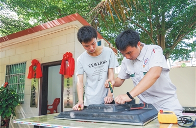 本报三亚7月27日电 (记者徐慧玲)“你们帮忙检查一下,这两个电风扇还能‘拯救’吗?”7月27日10时许,三亚市吉阳区红花村村民罗春艳提着两个落地电风扇赶到落笔大社区“义剪义修站”,“丢了也怪可惜,这里有专业的修理人员免费维修,我来碰碰运气。”