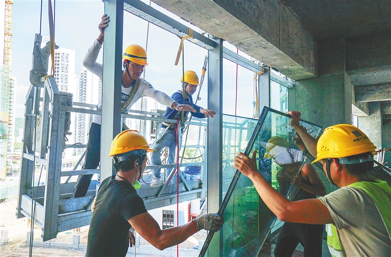 7月28日,在三亚太平金融产业港项目建设工地,工人在安装玻璃幕墙。今年以来,三亚中央商务区建设加速推进,上半年完成投资约42亿元,同比增长36.8%