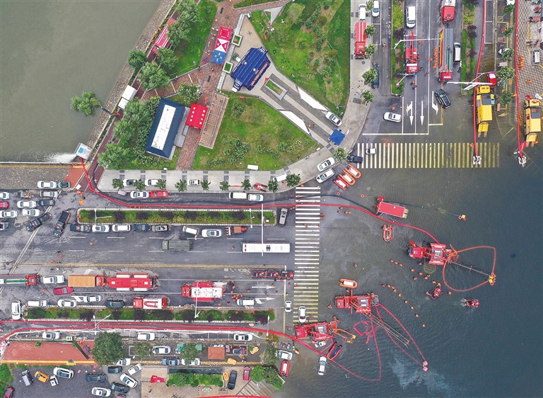 图为消防救援人员在卫辉城区进行排涝作业。 新华社记者 李安 摄