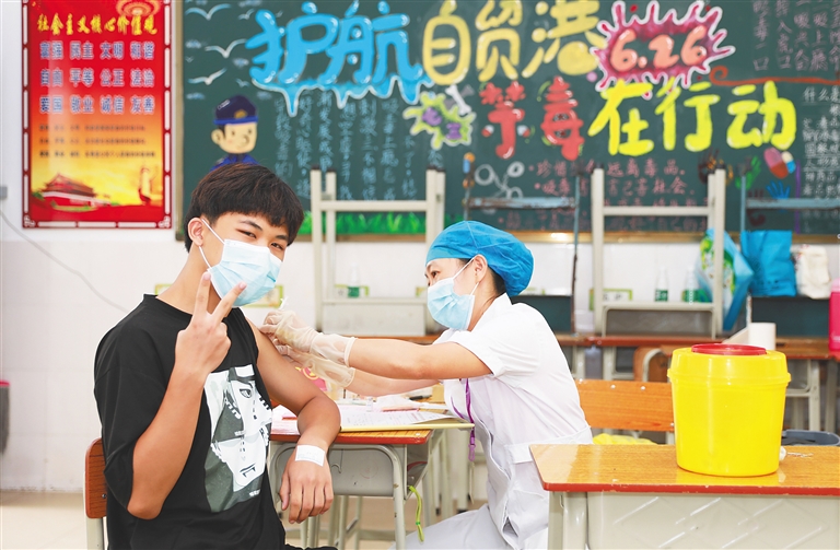 近日,琼中黎族苗族自治县全面启动12岁-17岁人群新冠疫苗接种工作,在该县人民医院、营根社区卫生服务中心和华中师范大学琼中附属中学思源实验学校设置固定接种点,方便周边学生接种新冠疫苗。图为一名中学生在接种新冠疫苗。本报记者 李天平 摄