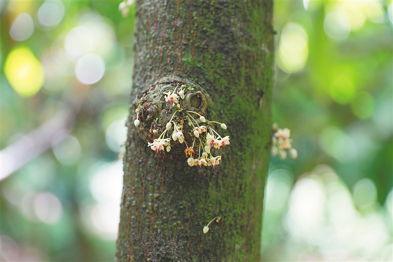 橙色、黄色、褐色、绿色……不同颜色的椭圆形果实挂在树干上,远望像是一棵棵“彩虹树”,其实,它们是美味巧克力的来源——可可树。这是7月23日,海南日报记者在万宁市兴隆热带植物园见到的一幕。