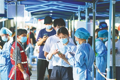 图为7月29日,在南京市玄武区新街口街道北门桥社区核酸检测点,工作人员在为市民登记身份信息。 新华社记者 李博 摄