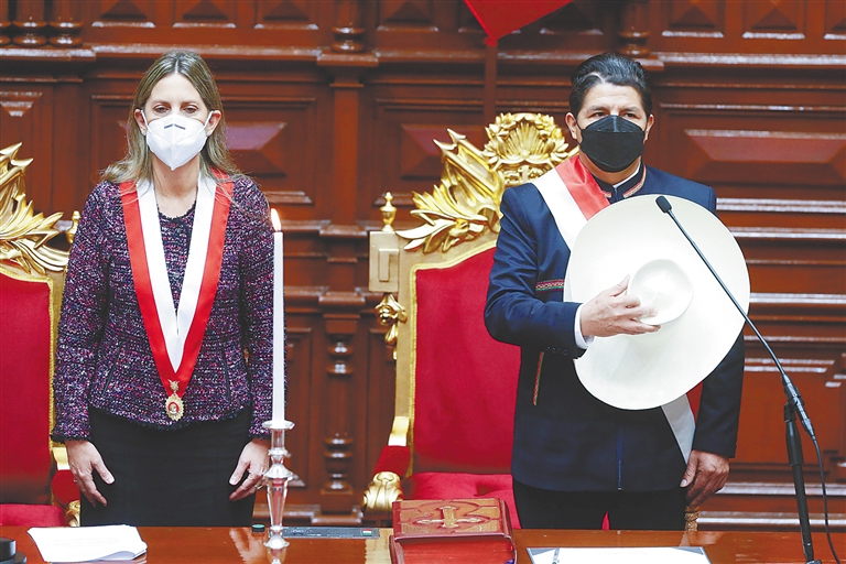 秘鲁当选总统卡斯蒂略28日在国会正式宣誓就职,任期5年。现年51岁的卡斯蒂略作为自由秘鲁党候选人,在今年6月6日举行的总统选举第二轮投票中击败人民力量党候选人藤森庆子,当选秘鲁总统。 新华社/路透