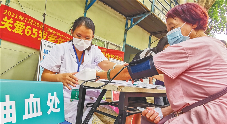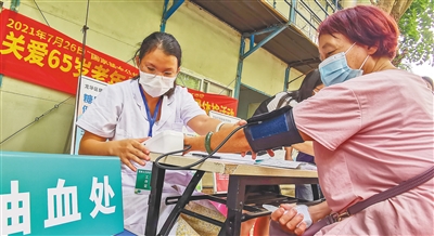 7月29日,海口市四季华庭社区卫生服务站的医护人员走进社区,为65岁以上老年人开展免费健康体检,并为他们普及健康知识。