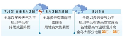 本报海口7月30日讯 (记者习霁鸿 通讯员刘爽 翁小芳 吴春娃)海南省气象台7月30日预报,未来7天,初期和后期全岛以多云天气为主,局地午后有阵雨或雷阵雨;中期全岛多阵雨或雷阵雨,局地有大到暴雨。