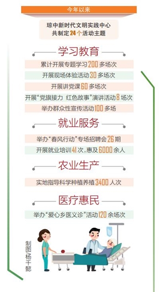 今年以来,琼中新时代文明实践中心共制定24个活动主题,累计开展专题学习200多场次、开展现场体验活动30多场次、开展讲党课60多场次、开展“党旗接力 红色故事”演讲活动8场次,举办群众性宣传活动100多场;举办“春风行动”专场招聘会26期,开展就业培训41次,惠及6000余人;实地指导科学种植养殖3400人次;举办“爱心乡医义诊”活动120余场次。通过常态化开展理论宣讲、文化教育、科技法律、科普教育等志愿服务活动,推动文明实践上连“天线”下接“地气”。(本报营根7月30日电)