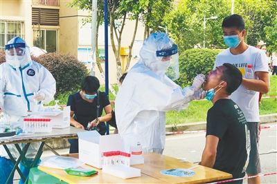 7月30日,重庆市江津区双福街道怡云社区王家湾还房B区的居民在当地政府的组织下有序进行核酸检测。