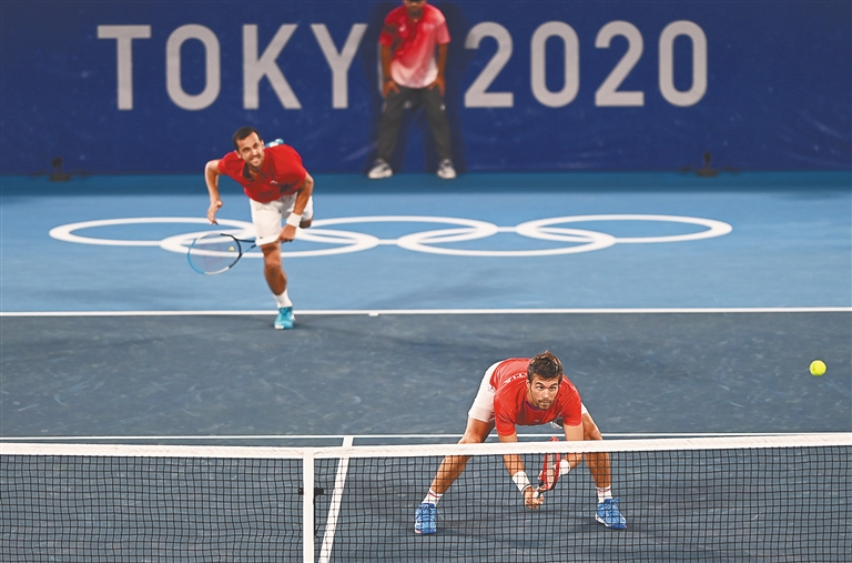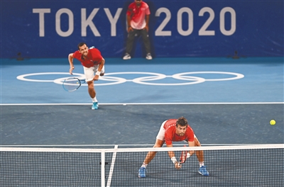 7月30日,克罗地亚队梅克蒂奇/帕维奇(左)战胜队友,获得网球男子双打冠军。