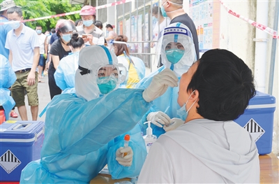 8月1日,海口市龙华区城西镇头铺村农贸市场旁,医务人员正在进行新冠病毒核酸检测取样。