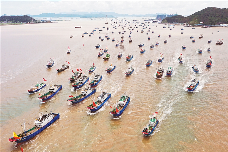 当日中午12时,浙江沿海地区的部分渔船结束伏季休渔,驶出渔港,奔赴渔场。 新华社发
