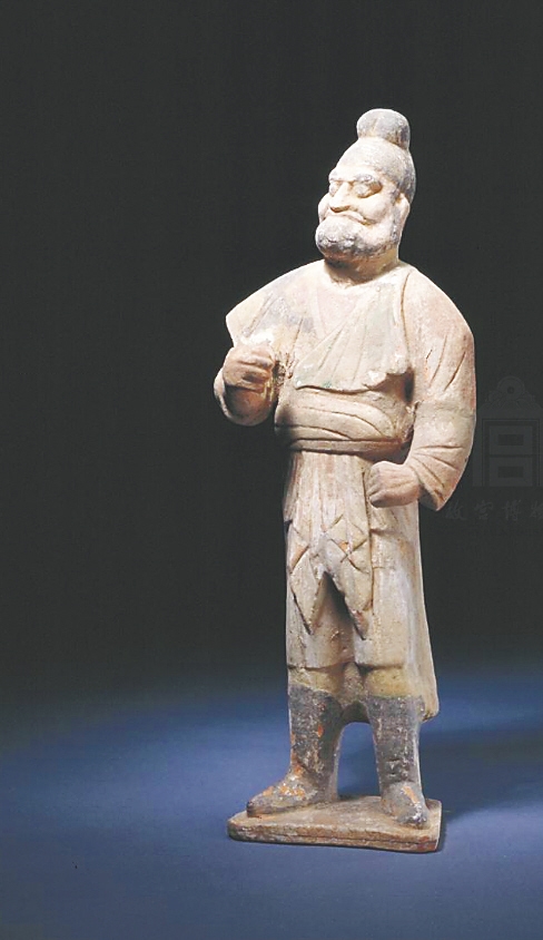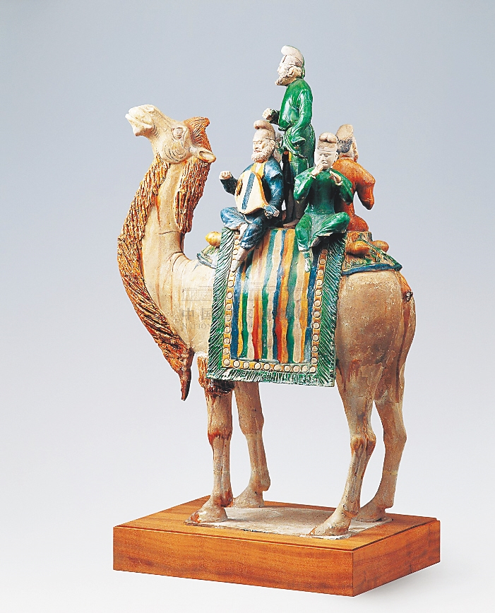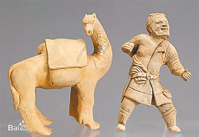 在中国古代陶俑中,胡人俑特点突出,非常容易辨别,因为他们的形象大多高鼻深目、满脸胡须,或宽额大眼、束发缠巾,兼之袒胸露腹、动作豪放,有着明显的异域特征。和胡人相伴的往往有骆驼、马匹或装运的货物等,这也体现了当时丝绸之路对中原的影响。