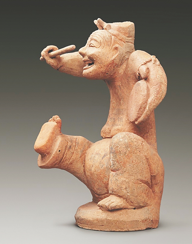 从艺术细节上看,汉代陶俑的制作水平仍旧略显粗糙,但其造型生动,人物形象可爱,充满了世俗的人情味和生活情趣,这无疑是制陶艺术的一个突破。以四川成都天回山东汉崖墓出土的“击鼓说唱俑”为例,这尊陶俑头戴巾帻,上身袒露,下着长裤,两肩高耸,赤足席地而坐。他左手抱鼓,右手高举鼓槌,脸上喜笑颜开,一副憨态可掬的囧态。如此形象,即便是两千年的后人,也不免会被他逗乐。