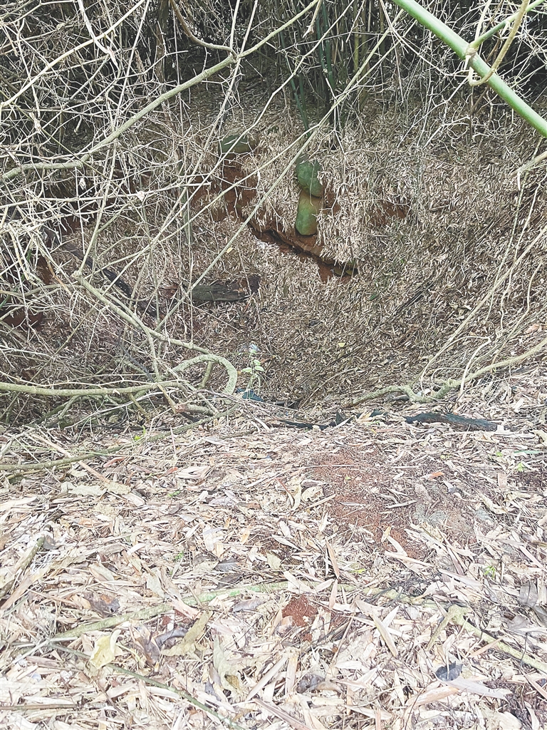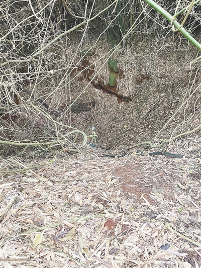 一段路程,很快就到了。惠通泉真的湮没了,它静静地藏在灌木横生的剌竹丛里,远远只见一处土井,看得并不真切。黄奕芳站长挥动砍刀,劈出一条通道,才一步一步靠近。这所谓的“惠通井”里落满竹叶,没有一点泉水,也没有“庵僧惟德以水饷焉,而求为之名”。