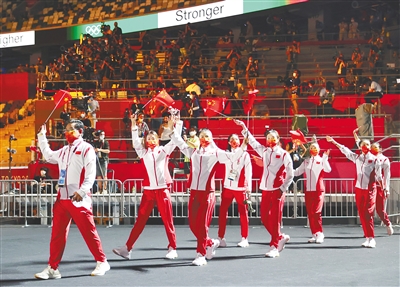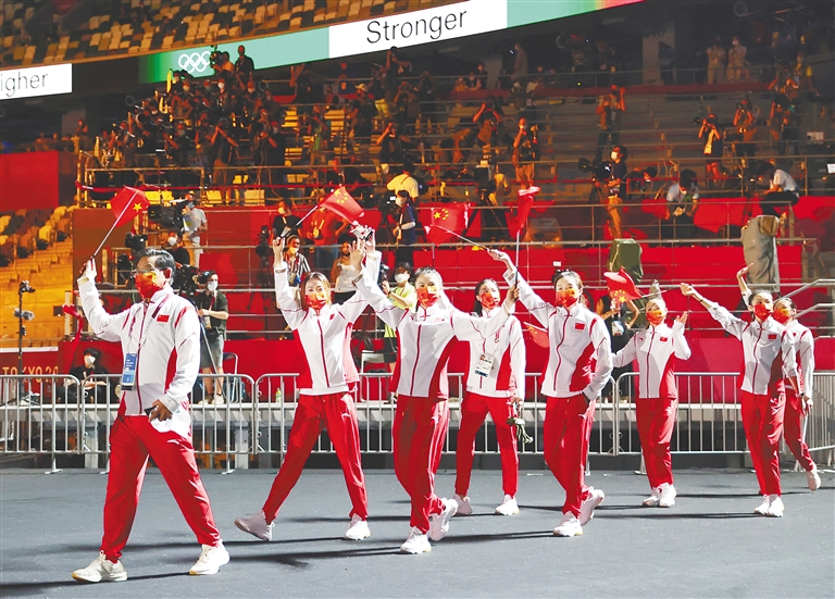 在奥运五环旗引领下,206个代表团运动员代表依次入场。在东京以9秒83创造男子百米亚洲纪录的苏炳添作为中国代表团旗手,高举五星红旗出场。
