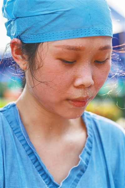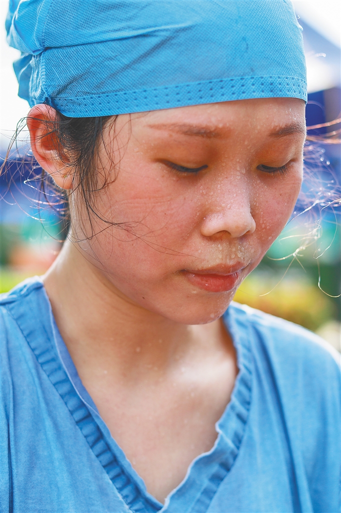 8月8日,海口气温较高,医护人员在各个核酸检测点挥洒汗水。挂在医护人员脸上的汗珠,是他们最美的妆容。本报记者 李天平 摄