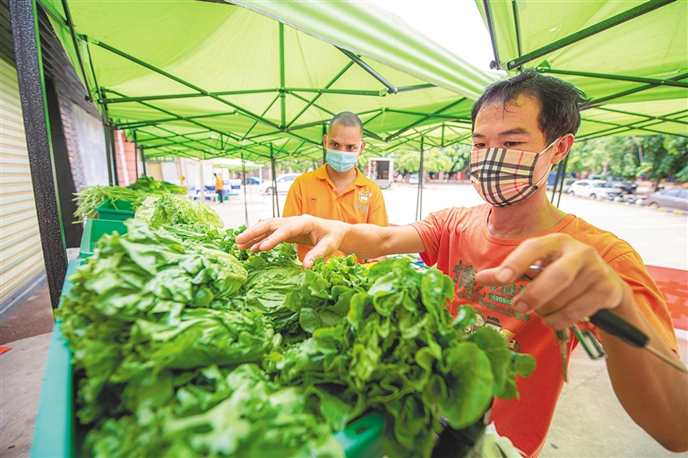 据了解,海口市菜篮子产业集团联合京东集团推出菜篮子京喜移动菜站,做好民生保障工作。目前已在指定区域安排两辆菜篮子京喜移动菜站(车),投放销售蔬菜,确保疫情防控期间居民的“菜篮子”量足价稳。本报记者 袁琛