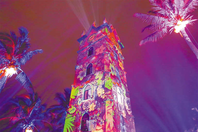 不仅如此,海口钟楼还“披上”了“新衣”。今年,海口市龙华区推出《光景·钟楼》主题光影秀。在历史文化与光影艺术的交融中,一帧帧画面讲述着动人的故事,赋予了海口钟楼全新气象,吸引不少市民游客前去观赏。