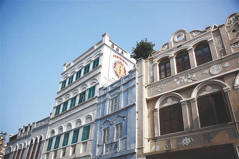 与海口钟楼隔路相望的是海口骑楼老街。海口骑楼老街是国内骑楼建筑保留规模大、保存完好的历史文化街区。这里的楼宇借鉴了当时的南洋建筑风格,略显斑驳的墙体留下了岁月的痕迹。