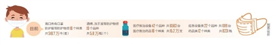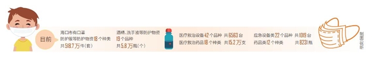 目前,海口市有口罩、防护服等防护物资18个种类,共518.7万件(套);酒精、洗手液等防护物资19个品种,共5.8万瓶(个);医疗救治设备42个品种共6563台;医疗救治药品18个种类,共15.2万支;应急设备类22个品种共1019台,药品类12个种类共8231瓶。