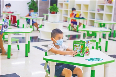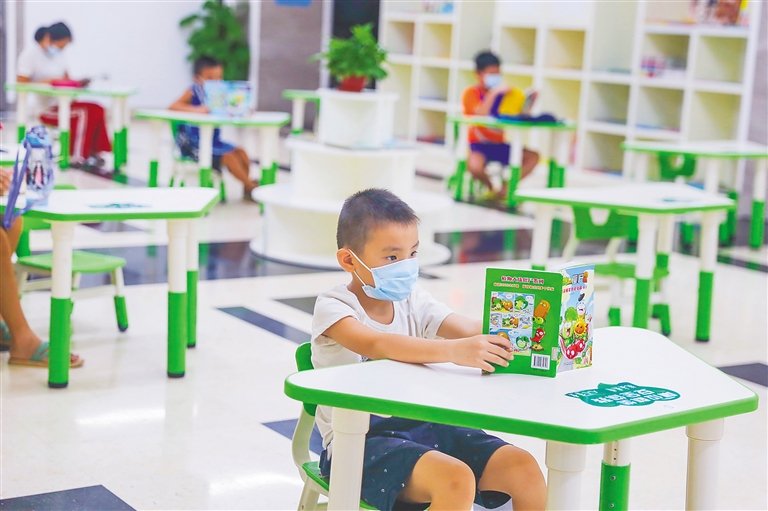 8月9日,在海口市美兰区公共图书馆的少年儿童阅览区,一名儿童在专心阅读。