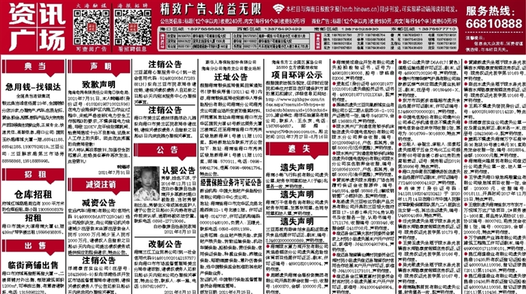 海南万千信息咨询有限公司遗失财务专用章、发票专用章、合同专用章和法人章,声明作废。