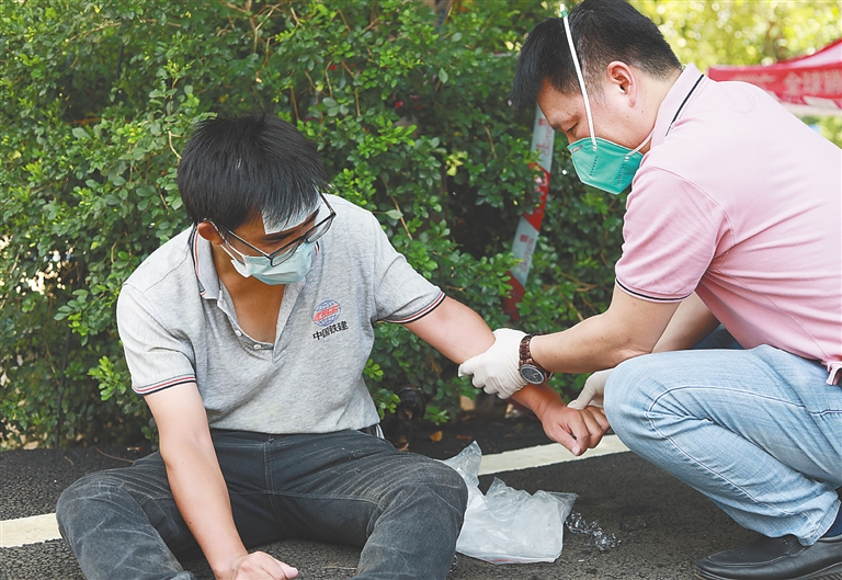 此时,傅雷躺在地面上,两只胳膊已经抽筋,他的双手紧握,无法自主张开。谢代彬便单膝跪地,为他逐个按摩手上的穴位。“应该是因为他的血液流通慢了,”谢代彬向海南日报记者解释,“按摩穴位能够促进血液循环。”