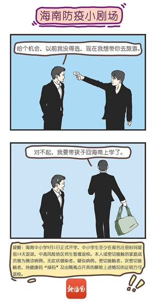 本报讯(海报集团全媒体中心记者吴春媚)战疫情,不放松。8月12日,新海南客户端、南海网、南国都市报推出漫画《海南防疫小剧场》,改编电影中的“名场面”,带你了解更多防疫知识。