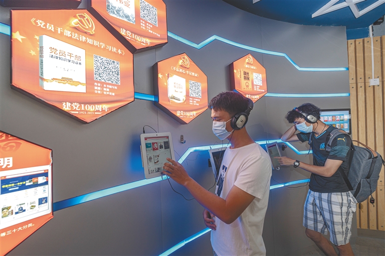 8月12日,海南省图书馆内,读者在聆听红色有声读物。