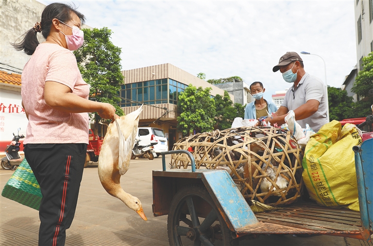 “新鲜山竹,10元1斤,包甜!”“自家养的走地鸡,香喷喷!”8月13日清早,在海口市琼山区云龙镇镇墟上,商贩们久违的叫卖声此起彼伏,声音响亮而清脆。