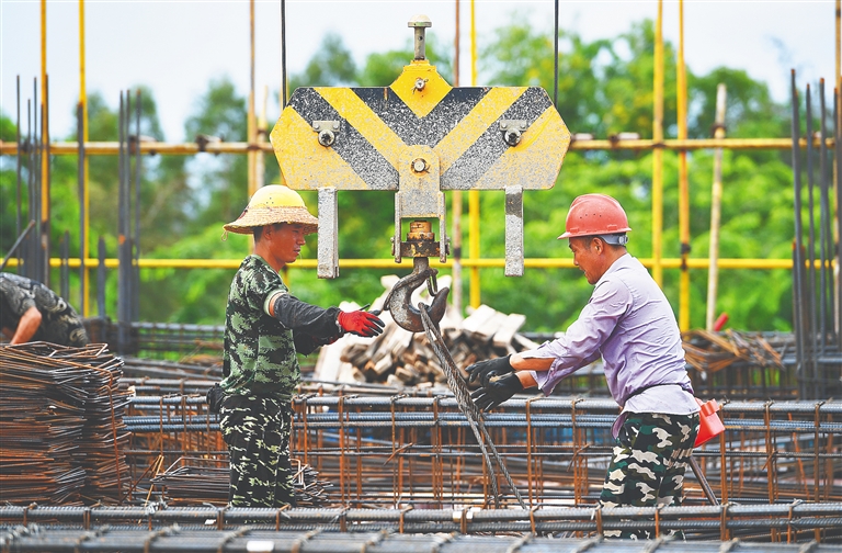 日前,工人在文昌国际航天城产业服务中心项目工地施工。目前,面积12平方公里的文昌国际航天城起步区建设正在稳步推进,“三横五纵”路网工程、文昌航天超算中心等重点项目在加紧建设中。 新华社记者 郭程 摄