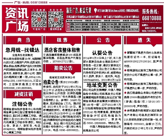 银达典当诚信经营23年,全国连锁分店25家,办理房产、汽车、名表、钻石、黄金、铂金、股票、数码产品及大宗房地产项目等典当贷款业务。正规专业、快速灵活、高额低息。海口公司:国贸玉沙路椰城大厦一层。68541188、68541288、13307529219。三亚公司:三亚解放路第三市场旁 88558868,13518885998。