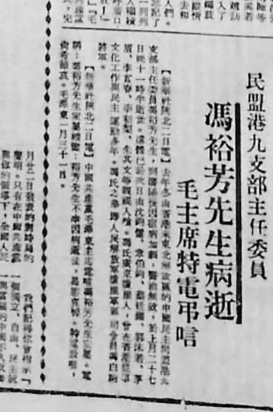 1948年底,毛泽东电请冯裕芳北上参加全国政协筹备会。此时的冯裕芳已60多岁,体弱多病,仍然带病北上。1949年1月27日,他在北京病逝,这位矢志革命的爱国者走完了他的一生。同年1月31日,毛泽东对他的逝世致唁电示哀。