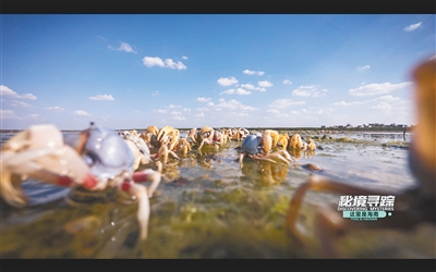 每次潮水退去,招潮蟹、和尚蟹、泥蟹等滩涂蟹在海滩上四处爬行、打洞。表面上看,它们是在挖沙打洞,取食泥巴,实际上,滩涂蟹并不是在食用泥巴,而是在过滤食用泥土中的藻类、浮游生物等有机物质,帮助身体发育成长。
