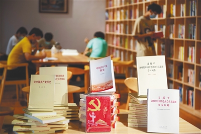8月16日,几位年轻人在琼海新时代文明实践中心万泉河分中心阅览图书。在该中心,党史类书籍被摆放在醒目位置。