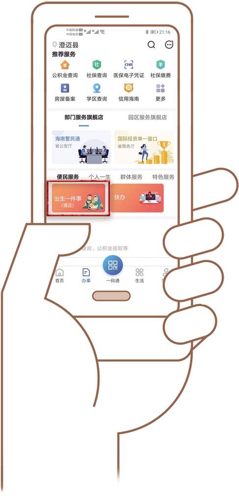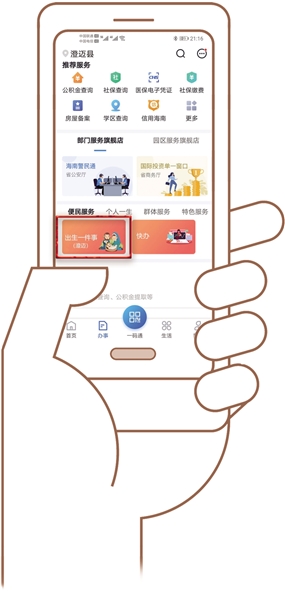 据悉,“出生一件事”目前正在澄迈县试点运行,已有13个新生儿家长通过“码上办事”App中的“出生一件事”享受到线上全流程集成服务,平均7个工作日即完成5件事的办理,省时省力又省心。