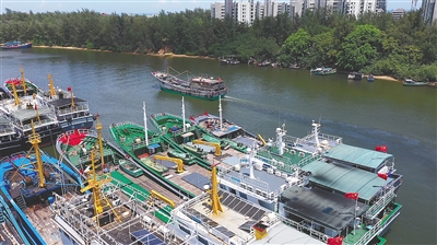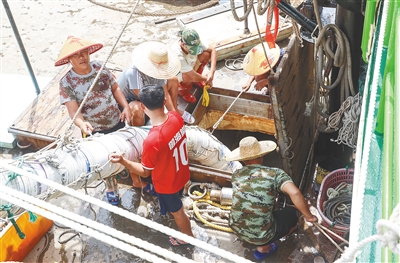 8月16日,在三亚崖州中心渔港,渔民在渔船上开展出海准备工作。 本报记者 武威 摄